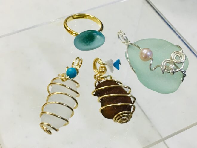 こちらが丸線とシーグラスの作品。