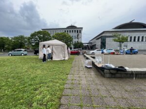 まず芝生ブースのマーキング作業をして、実行委員と助っ人数人で手分けしてキッチンカーブースのマーキング、本部設営、ステージ控え室テント設営、自分のお店の設営…