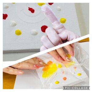 すぐに手を洗えないので、指にサックをして、ファーストアート用にはキャンバスを入れるビニールの袋を用意。