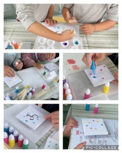 好きなシールをキャンバスに貼ってもらって、その上から絵の具を混ぜ混ぜしてもらうことにしました。