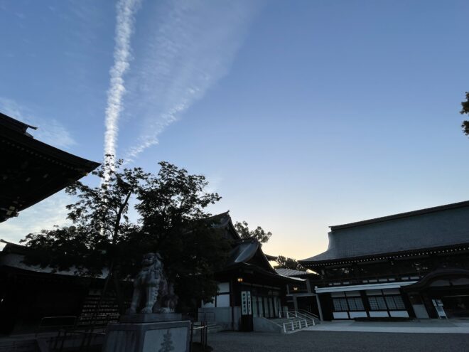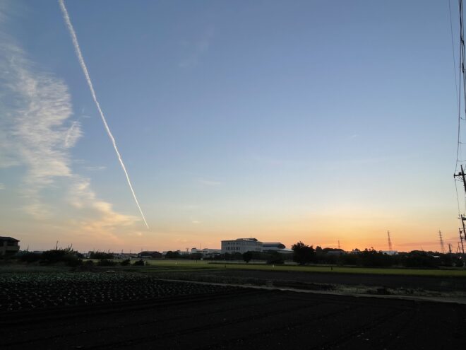 朝、5時過ぎから1時間程度歩いていますが、今朝は綺麗な飛行機雲を見ました。