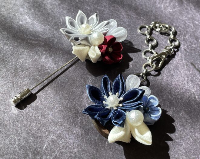 今回は、つまみ細工のバッグチャームまたはハットピンを作りました☆