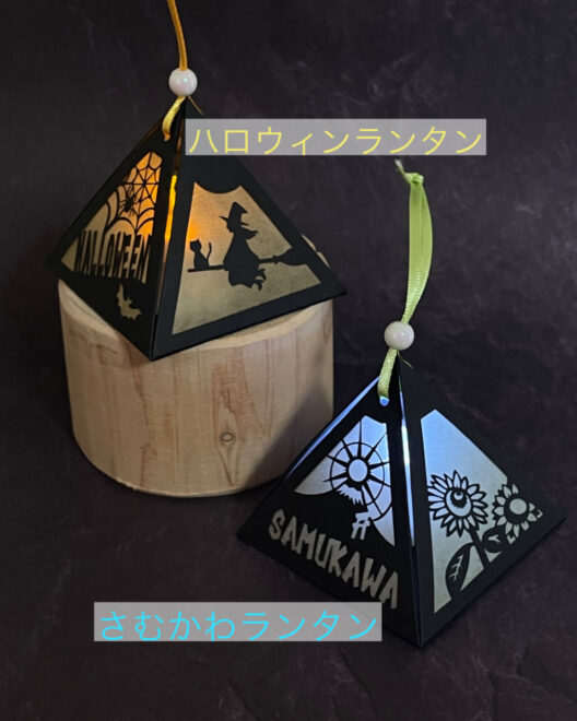 今年の春の桜まつりの出店で販売した、桜模様のミニランタンの評判が良かったので、紙製ではありますがしっかりした作りにして、ハロウィンの柄と寒川町にちなんだ柄と2種類のランタンを作りました。
